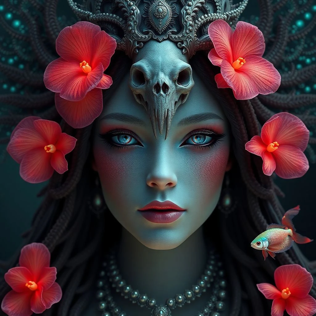 Goddess close-up portrait ribcagel. jellyfish phoenix head, nautilus, orchid, skull, betta fish, bioluminiscent creatures, intricate artwork . octane render, trending on artstation, t symmetrical artwork. cinematic, hyper realism, high detail, octane render, 8k
