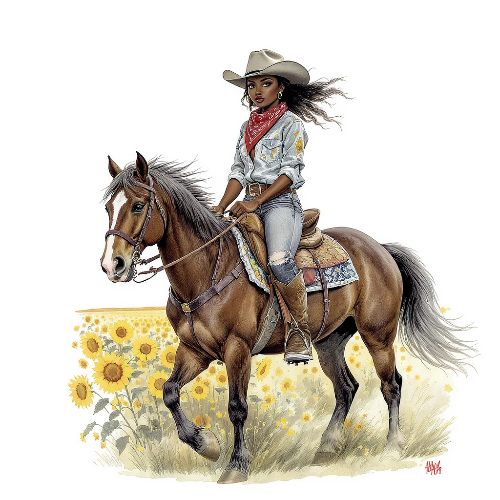 Isolated on a solid white background. Centered image. 400 pixels. An African American young lady in ripped jeans, a printed bandana shirt, and boots riding a horse in a field of sunflowers. Rendered in watercolor on a white background. All contained within the Pop Art-style image frame