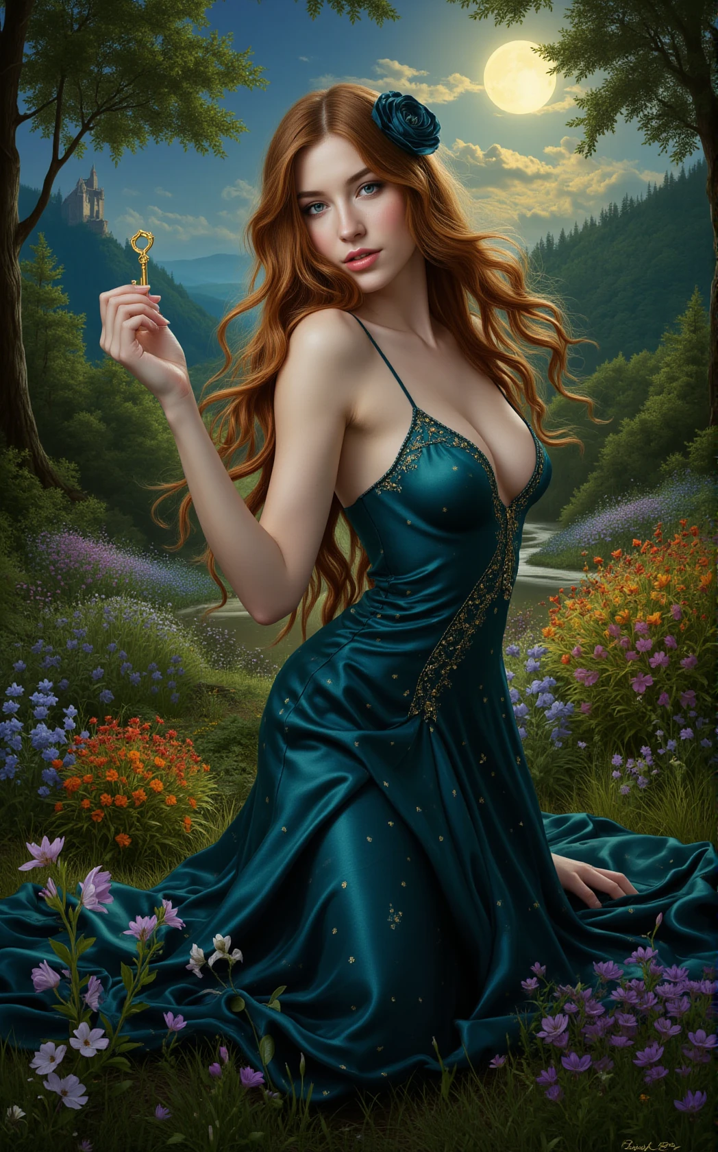 In the moonlight, a young woman with long, flowing auburn hair and an elegant hourglass figure kneels among a lush field of vibrant, dew-kissed flowers, holding a delicate, ornate key. She wears a deep-plunging, flowing gown of rich sapphire and emerald silk that glimmers softly in the silver light, adorned with subtle embroidery and tiny gems. Her serene face radiates a sense of magic and tranquility. In the distance, atop a gentle hill, a fairy-tale castle glows with golden light, surrounded by misty forests and sparkling streams. The oil painting is ultradetailed, warm, and luminous, evoking an idyllic, enchanted fantasy scene.