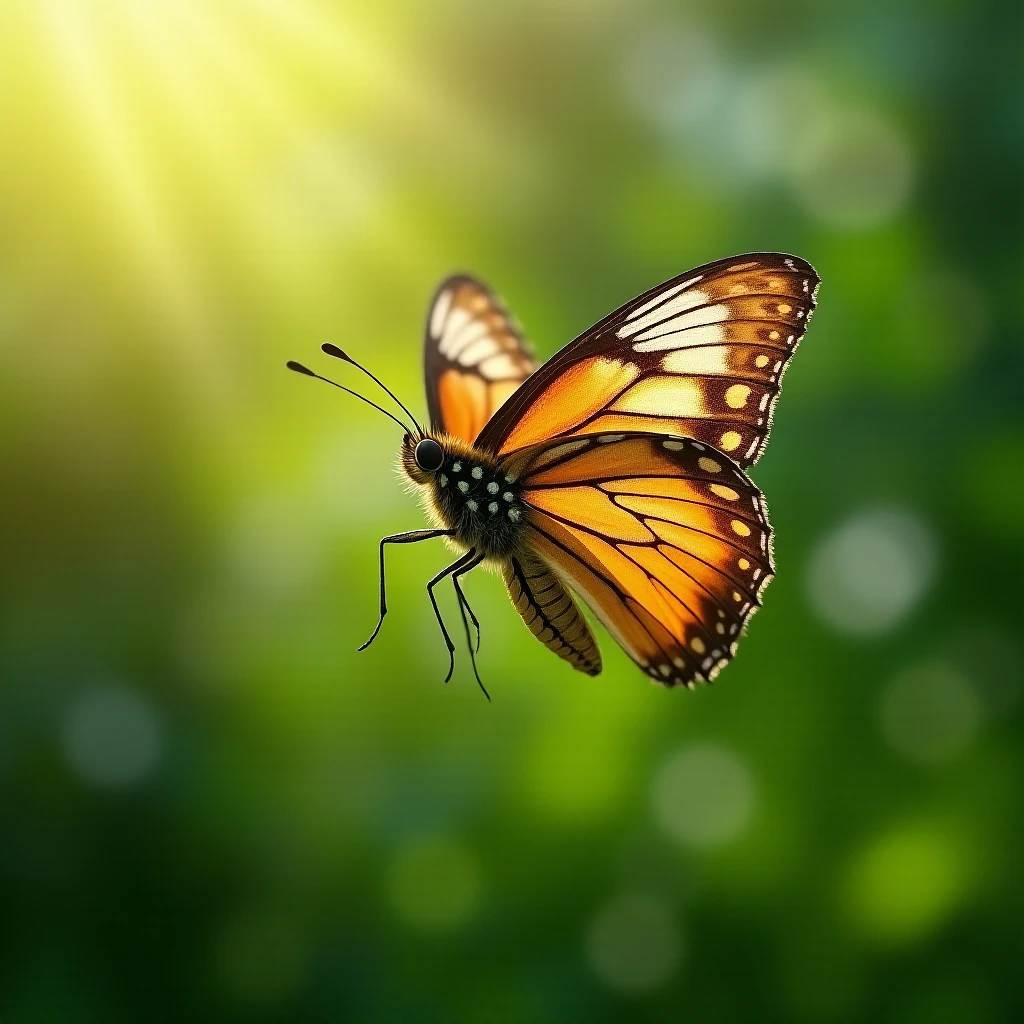 A National Geographic-style ultra-realistic close-up photograph of a butterfly in flight. The butterfly's wings are captured in mid-motion, displaying intricate patterns and vibrant colors. Every detail is highly defined, from the delicate scales on its wings to the fine hairs on its body. The background is softly blurred, highlighting the butterfly in sharp focus as it flutters against a backdrop of lush greenery and dappled sunlight. The image conveys the grace and beauty of the butterfly in a natural setting, with a level of detail that reveals the wonders of nature up close