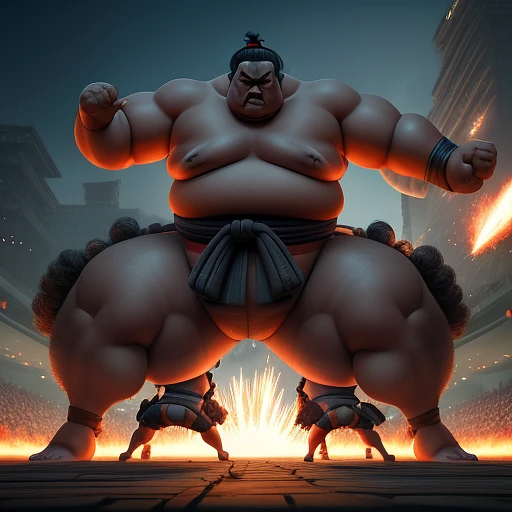 gigantic sumo titans fight each other with holy rage, masters, legendary champions, nanite rendering, volumetric lighting, ultra realistic, 8k