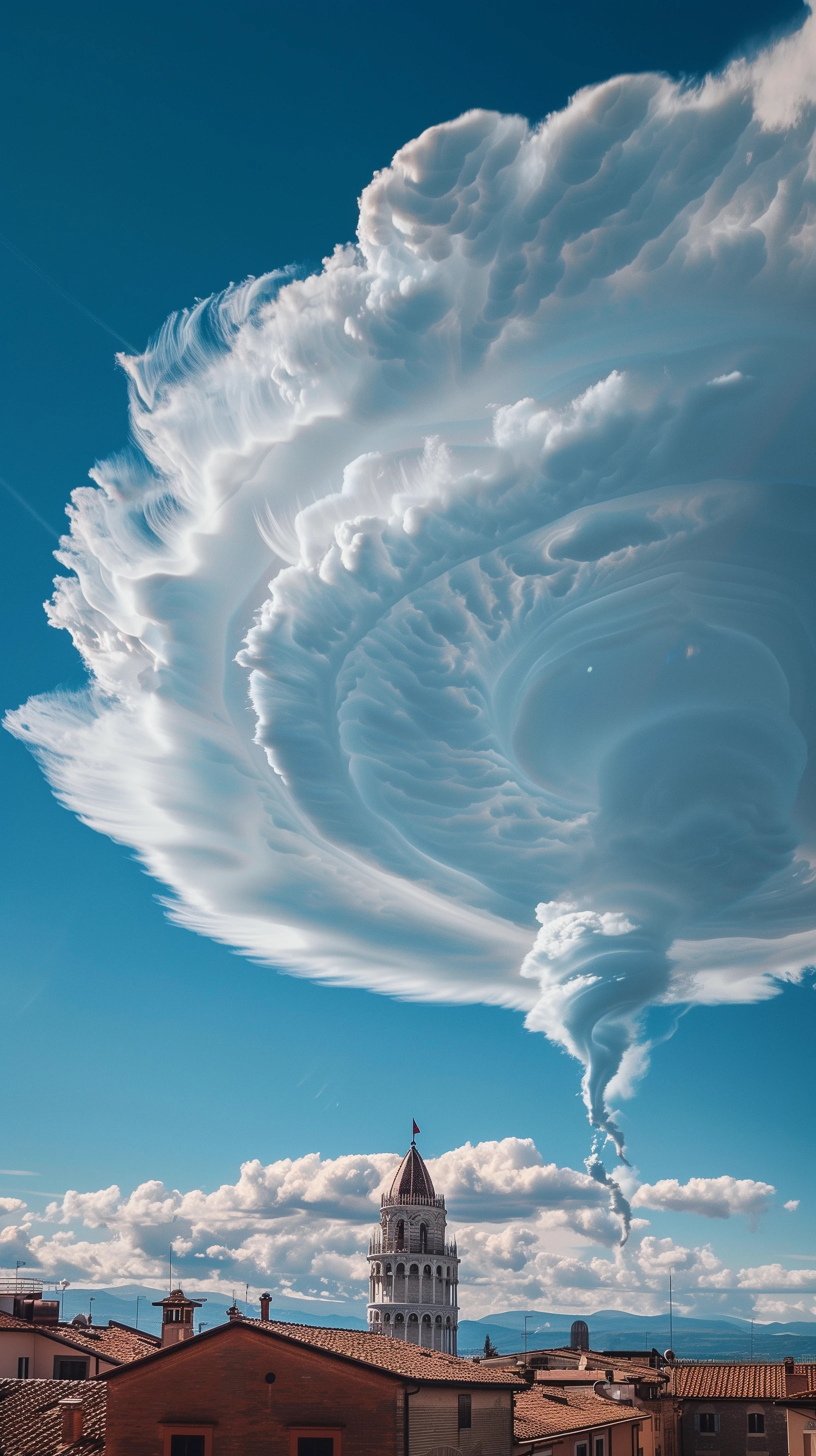 A photo of an alien cloud shaped like the roof and spire of Pisa's cathedral, floating over the city center in Ljub breachinana on a sunny day. The cloud appears to be in the style of Salvador Dali, 8k --ar 9:16 --v 6. 0