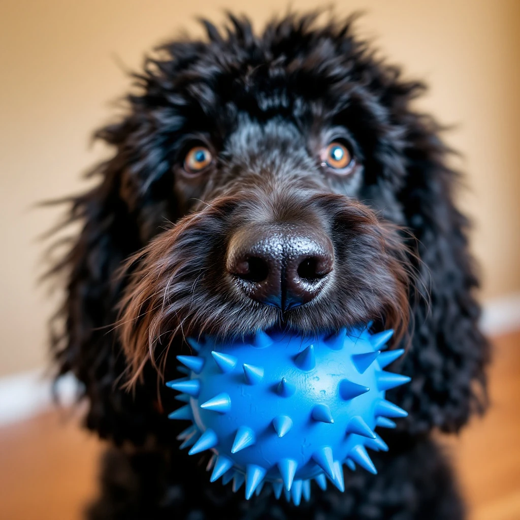 A close-up portrait of a black dog with curly hair, holding a blue toy in its mouth. the dog appears to be a standard poodle, with a long, curly black coat and blue eyes. it is looking directly at the camera with a curious expression, its nose slightly upturned and its mouth slightly open, as if it is about to take a bite out of the toy. the toy is round and has spikes on it, giving it a playful and playful look. the background is blurred, but it seems to be an indoor setting with a beige wall and a wooden floor. the focus is on the dog's face and the toy, making it the focal point of the image.