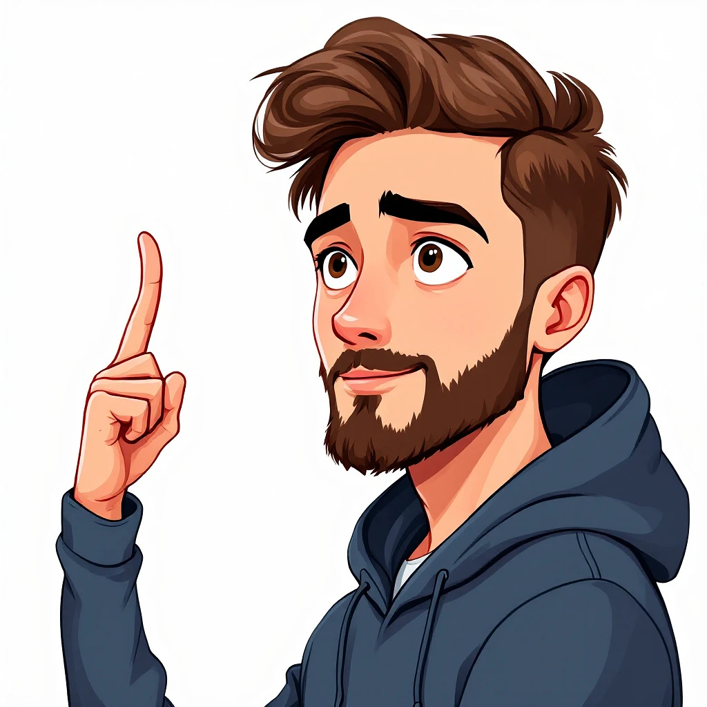 A profile picture of an animated cartoon headshot portrait of a young man with brown hair and a slight beard, wearing a dark blue hoodie with a hood, depicted in a side view with his arm fully extended and his finger explicitly pointing upward, his expression thoughtful and reflective, with a white or transparent background in a sticker-style illustration. --chaos 75 --ar 1:2 --stylize 750