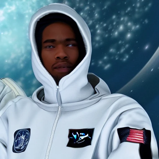a Blackman in a white ski mask and is wearing white track suit, with a nasa logo on his tracksuit, fighting bad guys in outter space.