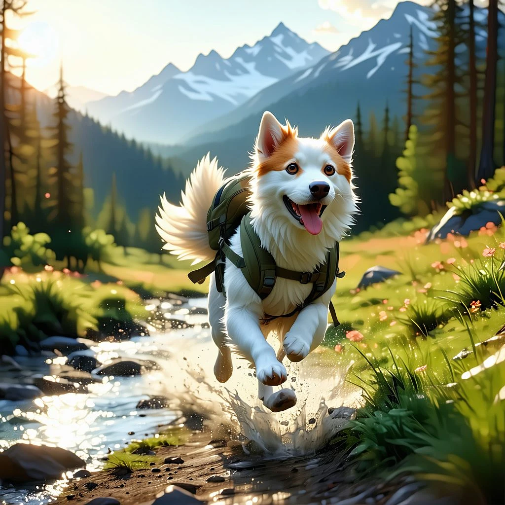hyper realistic, anime, anthropomorphic male dog, running, speed, fast, backpack, travel, trip, rush, landscape, forest, mountains, fields, river, sunset.