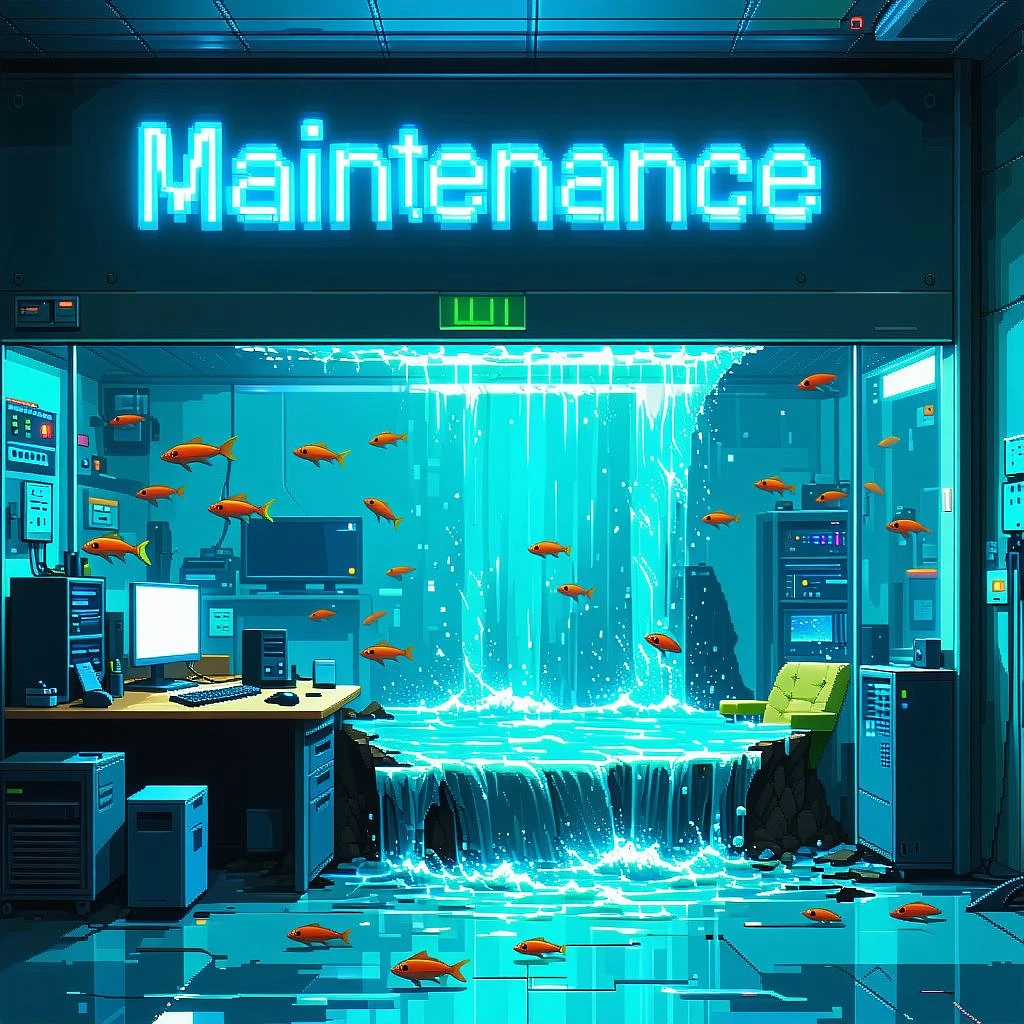 , , , , synth-wave city , 8 bit video-game style, Office in a giant aquarium has a hole in it with water flooding in spilling all over the floor in a large stream of water, anthropomorphized cats employees repairing servers while fish swim by, with a (large neon "Maintenance" sign:1.2) ,