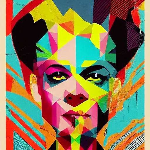 geometric abstract portrait of Bride of Frankenstein, bright vibrant colorful, shepard fairey --aspect 3:6