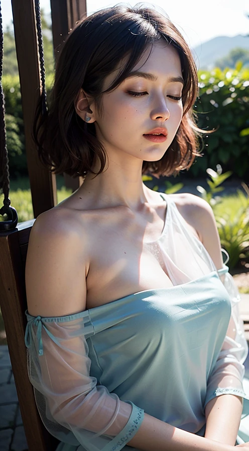 (RAW photo, best quality) , (realistic, photo-realistic:1.3) , extremely delicate and beautiful, Amazing, finely detail, masterpiece, ultra-detailed, highres, (best illustration) , (best shadow) , intricate, 1girl, (((wearing see through sleeper:1.4) )), (((off shoulders:1.4) )), silhouette, profile, sitting on the swing, sunset, (eye closed:1.4) , sharp focus, volumetric fog, 8k UHD, DSLR, high quality, (film grain:1.4) , Fujifilm XT3, <lora:LowRa:0.5>