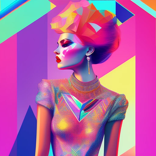 Prismatic beautiful woman character design, geometric print on clothes, monogram, sharp focus, colorful, clear, detailed, cinematic, detailed, glamorous, editorial, fashion shoot, fluff, dreamy glow, fantastic realism, kitsch rose outfit