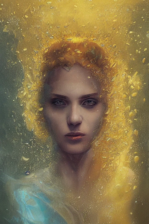 a portrait of an woman just under the surface or the water, yellow dress flowing in the current, angelarium, cinematic