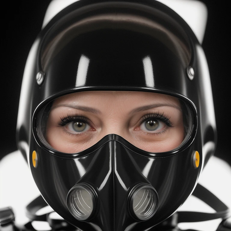 hyper realistic headshot photo of a 40 year old woman, wearing a latex gas mask, a black latex protective suit with latex hood, Extreme Close-Ups, Full Frame camera, ISO: 100, Aperture (f-stop) : f/1. 8, Shutter Speed: 1/30, Camera Lens: 85mm prime lens, Camera Eye Line: Low, Studio Lightning