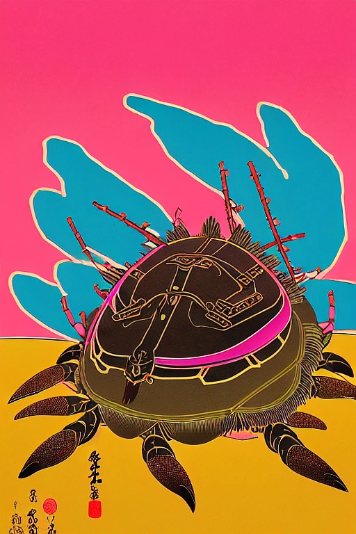a masterpiece ukiyo - e portrait painting of a horseshoe crab armored techno samurai in a cherry blossom field by remedios vari and anato finnstark and greg rutkowski and andy warhol and francis picabia, dayglo pink, dayglo blue, prismatic, glowing, trending on artstation