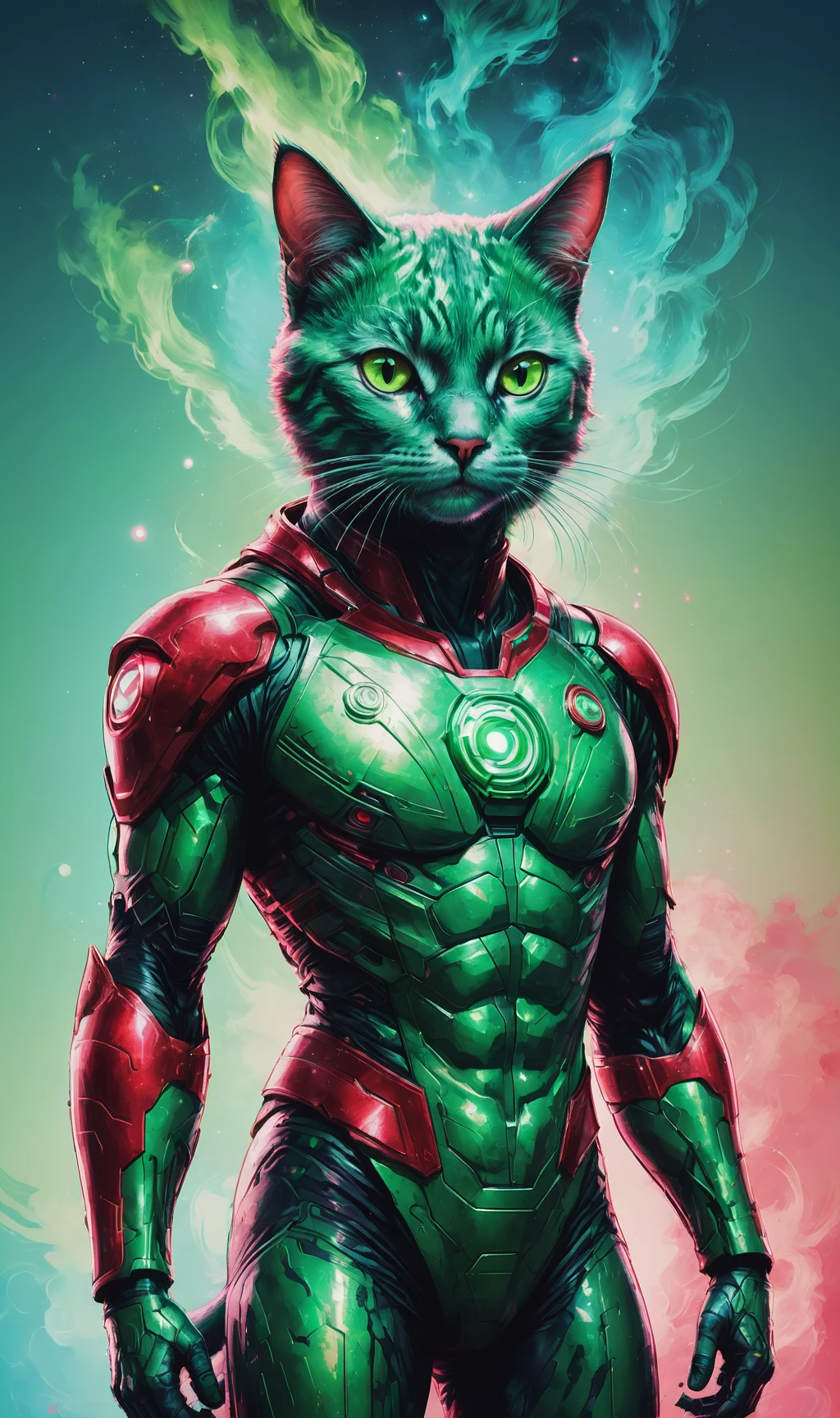 full body portrait of a Cat in green lantern suit, in the style of light sky-blue and crimson, digitally enhanced, genderless, vibrant figurative expressionism, neo-pop iconography, political illustration, grainy, digital sketch, minimal. <lora:add-detail-xl:1> <lora:SDXLFaeTastic2400:1>