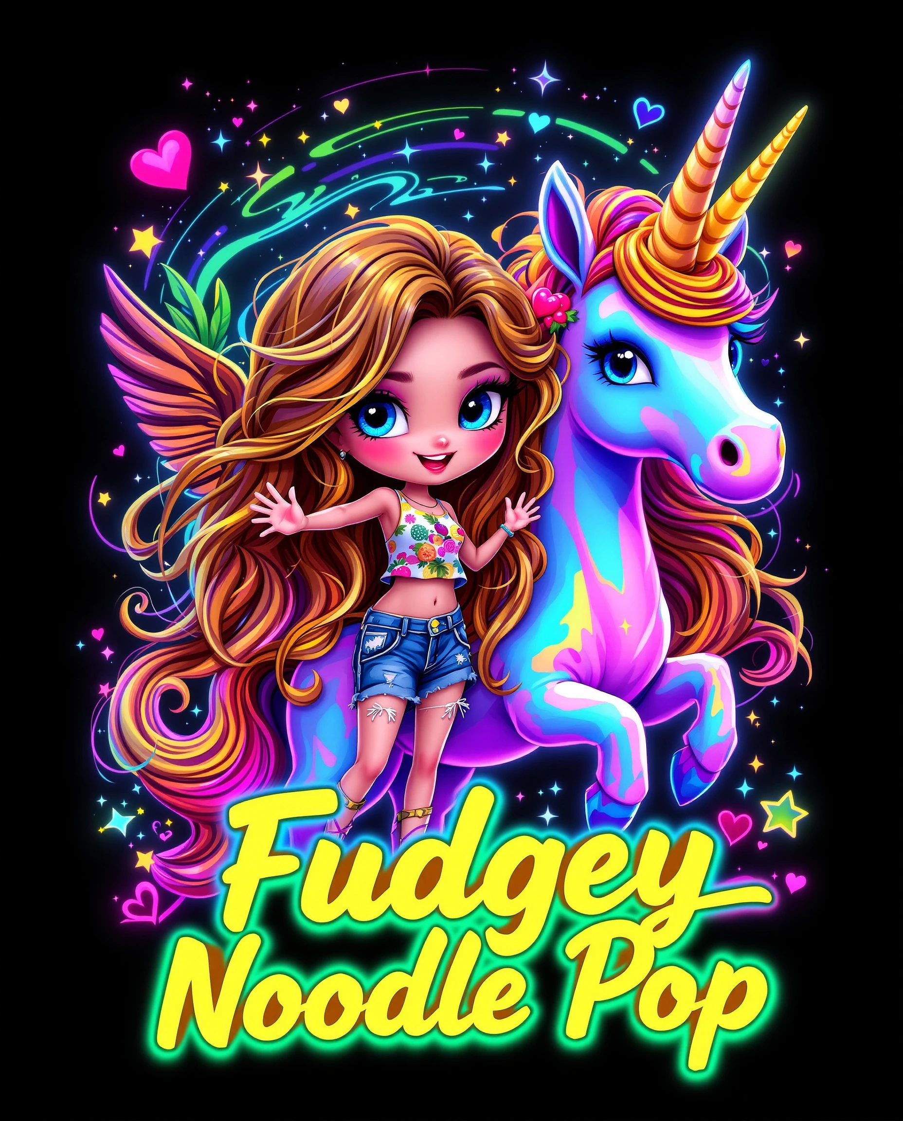 epic stunning fantasy ready to print tee shirt design featuring a beautiful sassy chibi cartoon animated anime girl and a unicorn with wings and long long mane and tail, tropical fruit salad fudgey noodle pop, long wavy chunky fudge hair smiling big expressive blue eyes, waving hi to the viewer, dressed in retro cutoff jeans and summer tops, singing, party celebration, love hearts, dance, musical fun funky art graphic black light ultraviolet funky cute chibi Tee shirt design bright bold vibrant rainbow neon colors 3D HDR rainbow electric High visual impact luminous fluorescent colors pearlescent mineral crystallized neon colors mixed with Acrylic coagulated pour, solid black background for contrast heavily textured Zach-effect neon laser X-ray lighting. 3D HDR black light UV poster art. the words "Fudgey Noodle Pop", is overlaid in a semi-clear transparent bright neon 3D Zach-effect fun and funky graffiti cursive script below central image