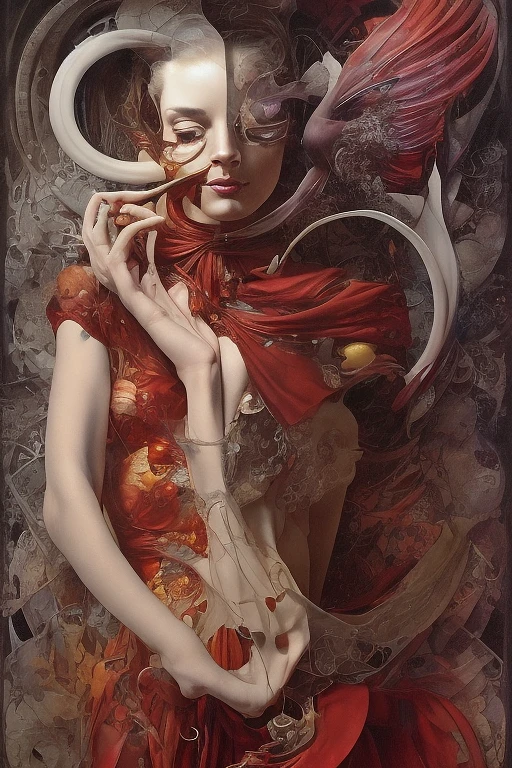(( A woman wearing silk dress + dark red skirt ) ) - HD Album Cover Art; Dave McKean + John J. Muth + Kent Williams; Award-Winning Render; Unreal Engine 3D; Symbolism; Colourful; Polished; Complex; UHD; D3D; 16K", (((art by Alphonse Mucha) )), black wall background, curved line composition, insane details, intricate details, low contrast, soft cinematic light, exposure blend, hdr, front Arriflex 535B, Nikon 6mm f/2. 8 fisheye lens, Kodak Vision2 500T 35mm film stock, lighting techniques aimes to accentuate the exaggerated colors and contrast in the scene, ultrahigh resolution, highy cinematic, super detailed, extremely high quality