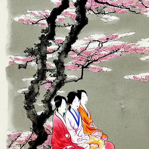 cascading plateaus with japanes sakura trees inside a crevice, women standing waiting, soft illumination, Impressionism, Traditional Chinese Ink painting, trending in Artstation