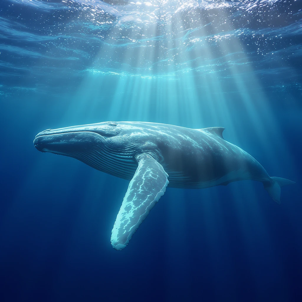 A colossal blue whale, suspended in the deep abyss of the ocean. Sunlight pierces the water in shimmering volumetric god rays, illuminating the whale's immense, graceful form. The scene is one of serene power and majestic scale. Hyper-detailed, photorealistic, cinematic lighting, profound tranquility. Signature: JDHampton + AI | Creative Alliance --ar 16:9 --style raw