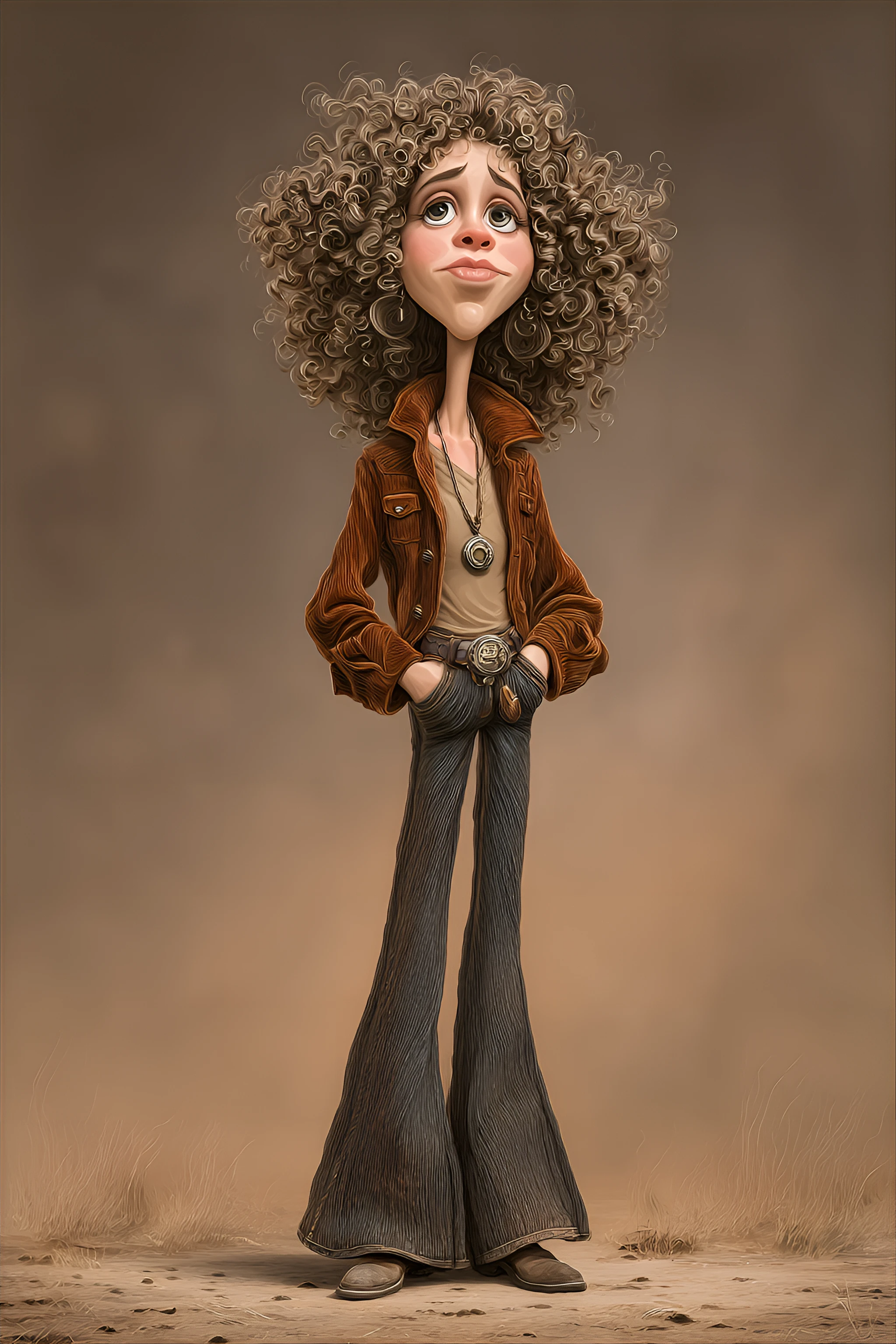 funny caricature, retro hippie caricature, caucasian ethnicity, 30 years old, free-spirited, relaxed, bohemian, exaggerated curly hair and impossibly long legs, exaggerated caricature, willowy and tall body type, round eyes, button nose, full lips, dreamy expression, the hippie is wearing a brown corduroy jacket, high-waisted flared jeans, and a neutral-toned shirt, accessorized with a large pendant necklace