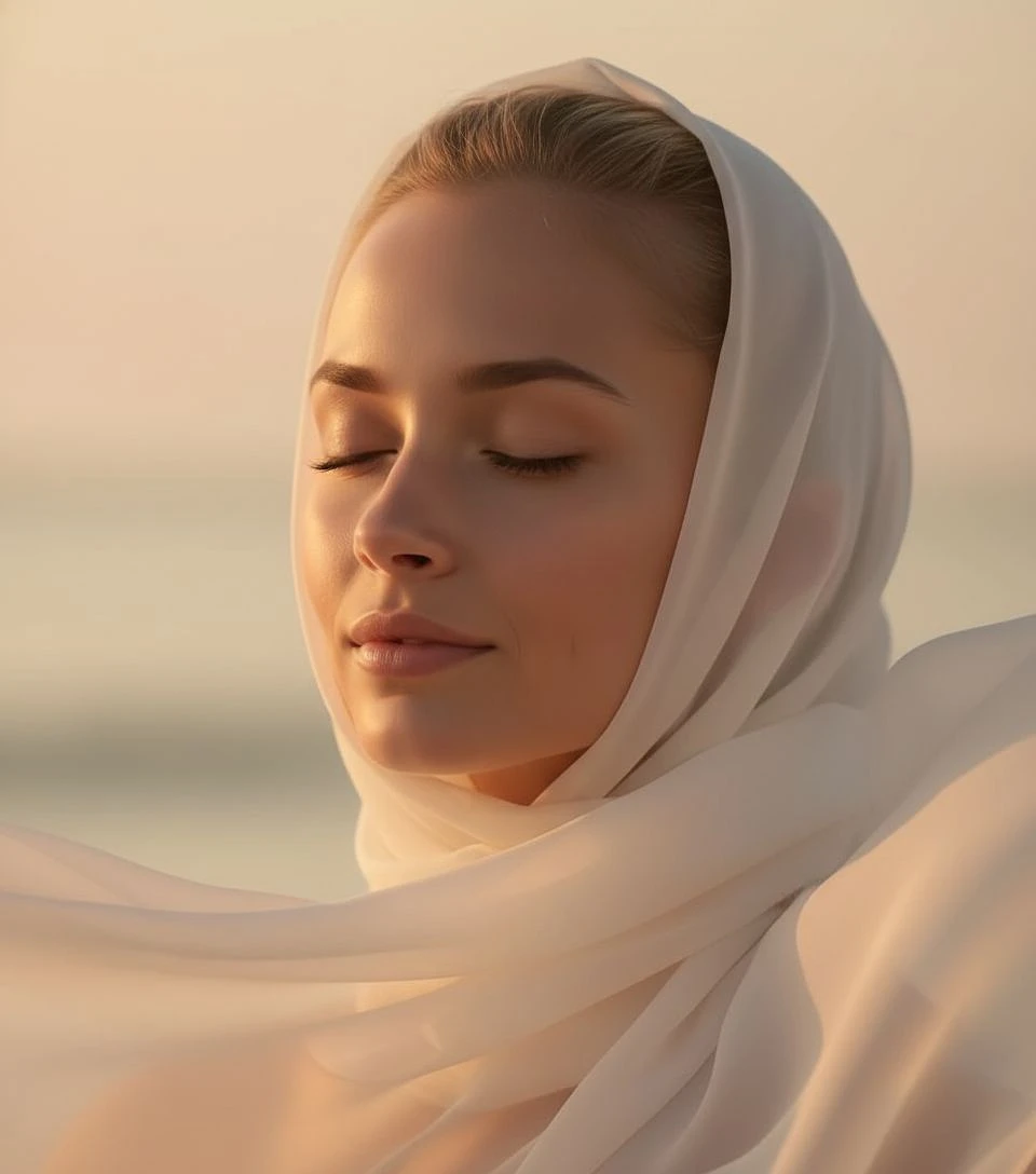 "Original: "Image is high resolution close-up portrait photograph. Featuring a beautiful stylish lithe fashion supermodel, early 20s, serene expression, eyes closed, fair skin, smooth flawless features. Soft warm light, casting a gentle glow across her face. She wears a flowing chiffon fabric that wraps elegantly around her head and shoulders, set against thick, hazy fog adding a sense of grace and fluidity to the composition. Background is a subtle gradient of warm tones. The overall style is modern and minimalist, focusing on the models serene beauty. "
