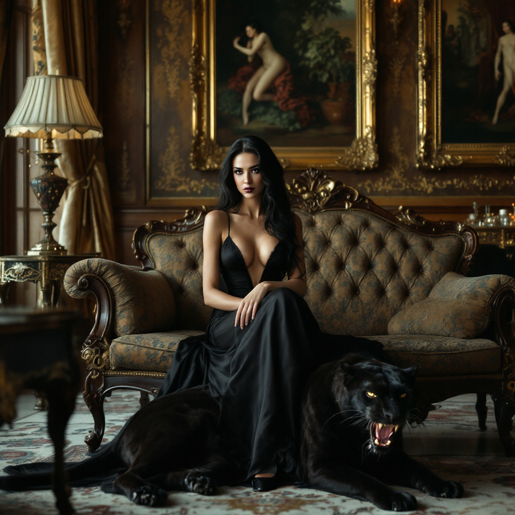 woman 35 years old, long black hair and well-carat, tall and thin, well-structured breasts, long black evening dress very tight and with an impressive neckline, very high-heeled shoes, on a leash she holds an imposing and aggressive black panther, the woman is sitting on a very luxurious Victorian sofa and the panther on the ground near her, setting inside a villa with valuable paintings and works of art.