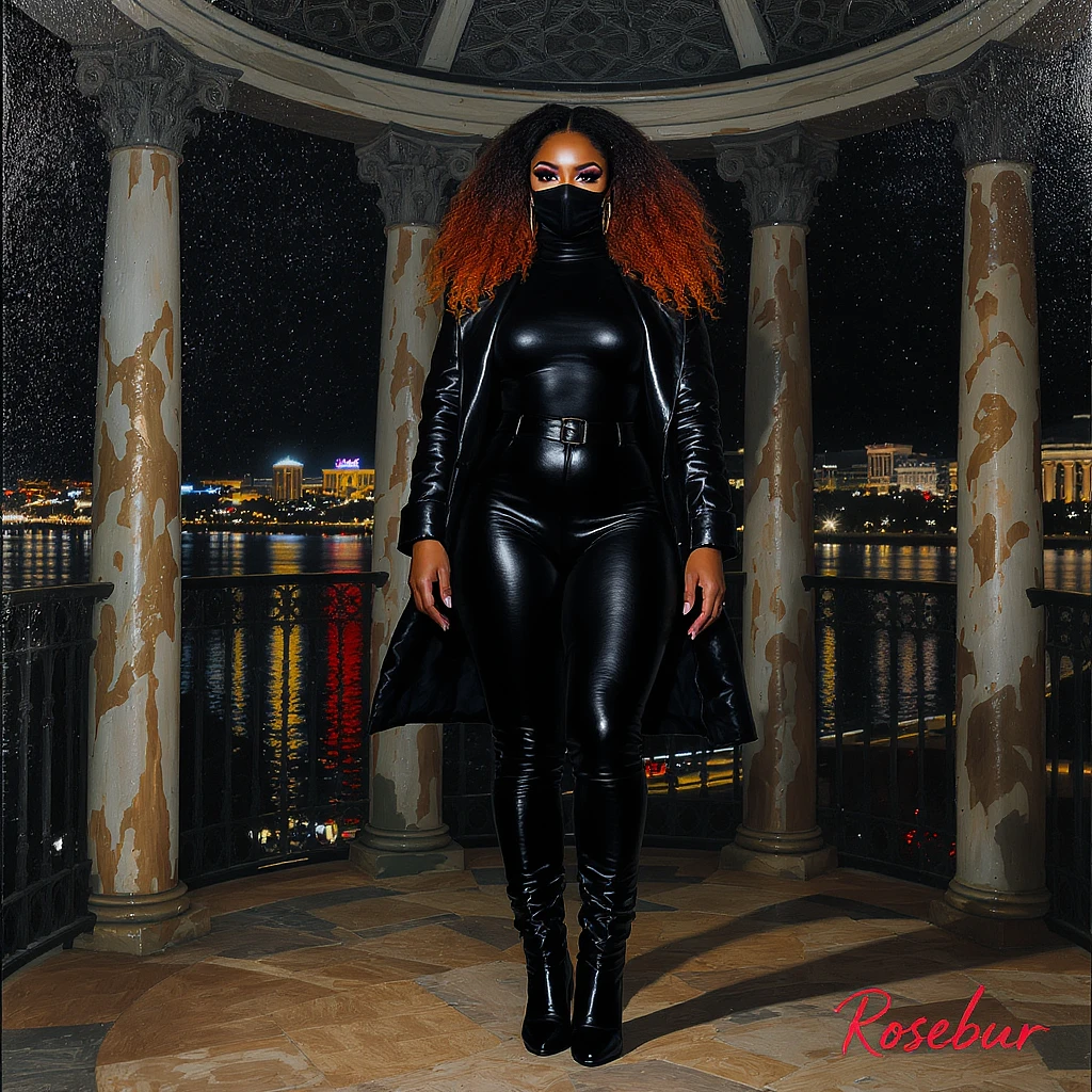 FULL BODY VIEW: 4K glossy oil painting of a regal large full-figure African American woman, standing under a gazebo, in full head-to-toe- body view, wearing a black turtleneck with a black mask covering the mouth and nose, black leather jumpsuit and matching leather jacket, with ombre wavy hair, detailed high heel boots, with a cityscape night background. . With 1px cursive font text 'Rosebur' in lower right corner.