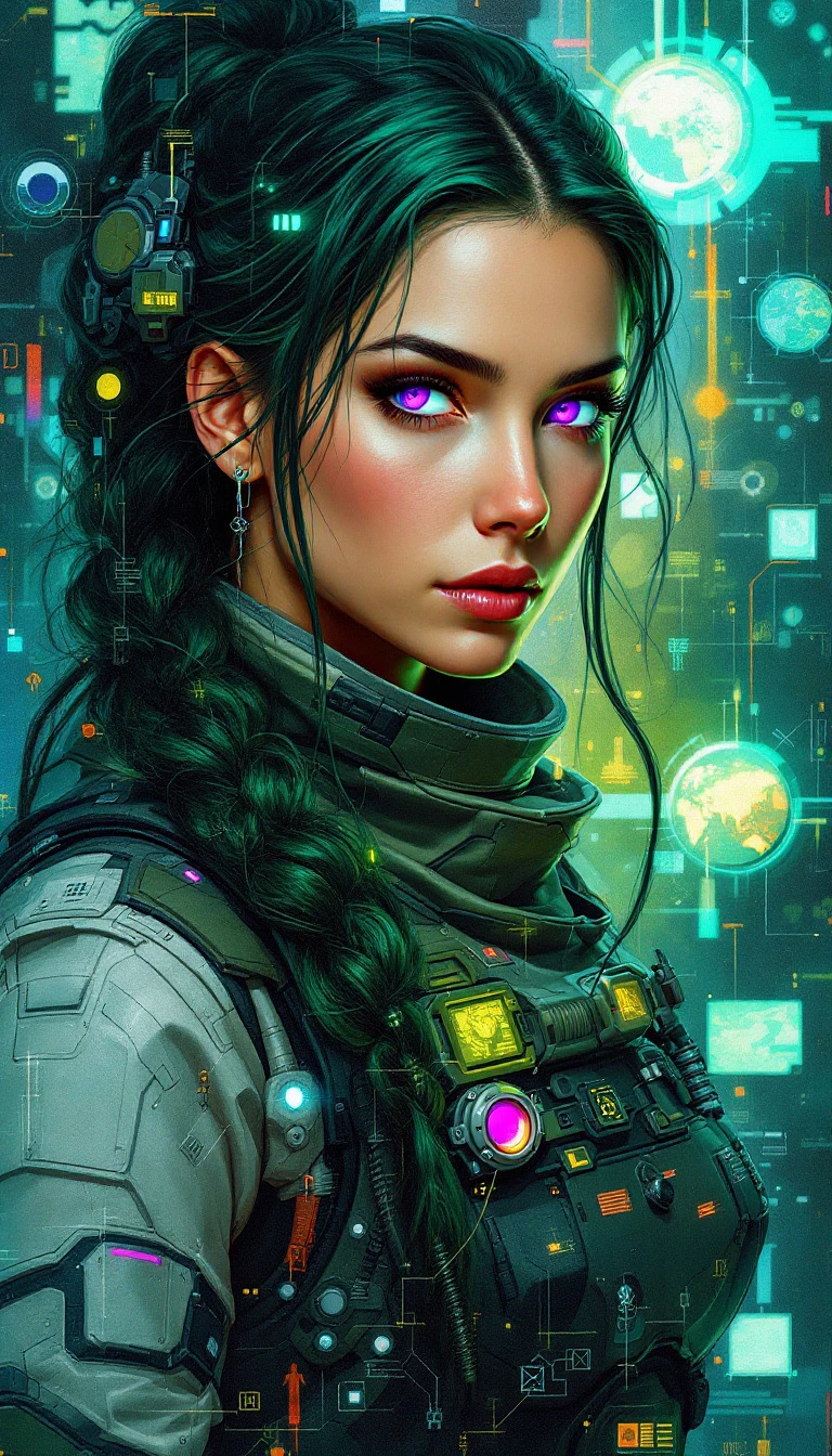 "Veridian Tactician in a Holographic Realm": A captivating abstract painting portrays a tactician, with a blend of intellect and a keen sense of strategy. She is a skilled leader, presented within a holographic environment filled with moving maps and tactical displays, with a tanned complexion, long, dark green hair that is pulled into a practical braid, and a layered uniform with cybernetic augmentations. Planning devices, communication arrays and holographic screens adorn her wrists and hands. The artwork skillfully blends contemporary techniques with a figure representation, creating a compelling scene that uses colors such as greens, blacks and blues. Her focused, violet eyes, the composition’s focal point, convey both a sharp mind and an unwavering sense of responsibility. After spending the day meticulously planning for the next conflict, the tactician embodies both intelligence and a clear, powerful resolve. The sharp details and dynamic elements invite the viewer to explore the hidden narratives within this vibrant artwork, presented as a painting.