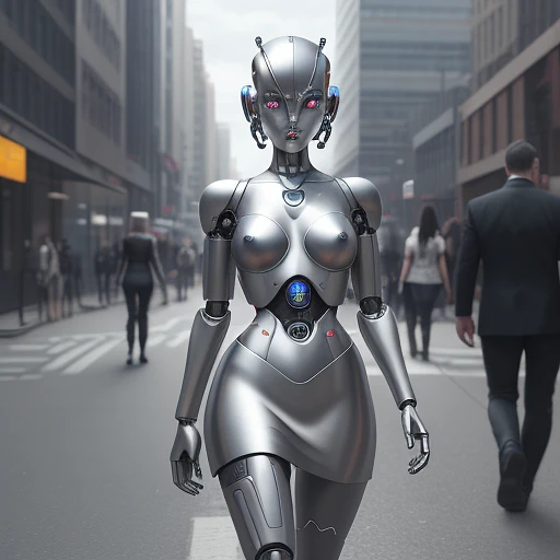 atomic heart, robot, cyborg, android, faceless, shiny silver metal body, mini skirt, walking on the street, city background, (((full body visible) )), looking at viewer, portrait, photography, detailed skin, realistic, photo-realistic, 8k, highly detailed, full length frame, High detail RAW color art, piercing, diffused soft lighting, shallow depth of field, sharp focus, hyperrealism, cinematic lighting, <lora:atomicHeartRobotMaid_001:0. 6>