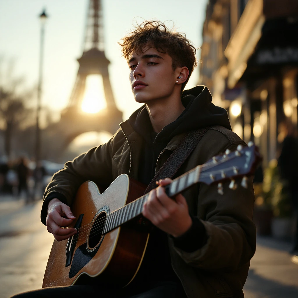 A portrait of An 18-year-old American guitarist performing on a sun-drenched Parisian street corner, near the Eiffel Tower, illuminated by golden hour light. Hyper-realistic style with precise details, weathered vintage Gibson guitar, modern streetwear, cinematic atmosphere, intimate documentary photography. The background is softly blurred, creating a serene and intimate atmosphere