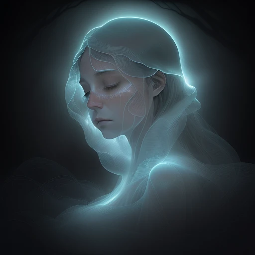 A hauntingly beautiful Marc Adamus-style illustration of a woman's face, ethereally crafted from soft, translucent Möbius strip shapes. The face is woven from mist and bathed in moonlight, with each intricate detail delicately rendered. The woman's eyes are closed, as if in deep contemplation, while the endless loop of the Möbius strips mirrors the cyclical nature of the universe. The background is a breathtaking starlit cosmos, with distant galaxies and nebulae swirling around her, creating a sense of vastness and infinity.