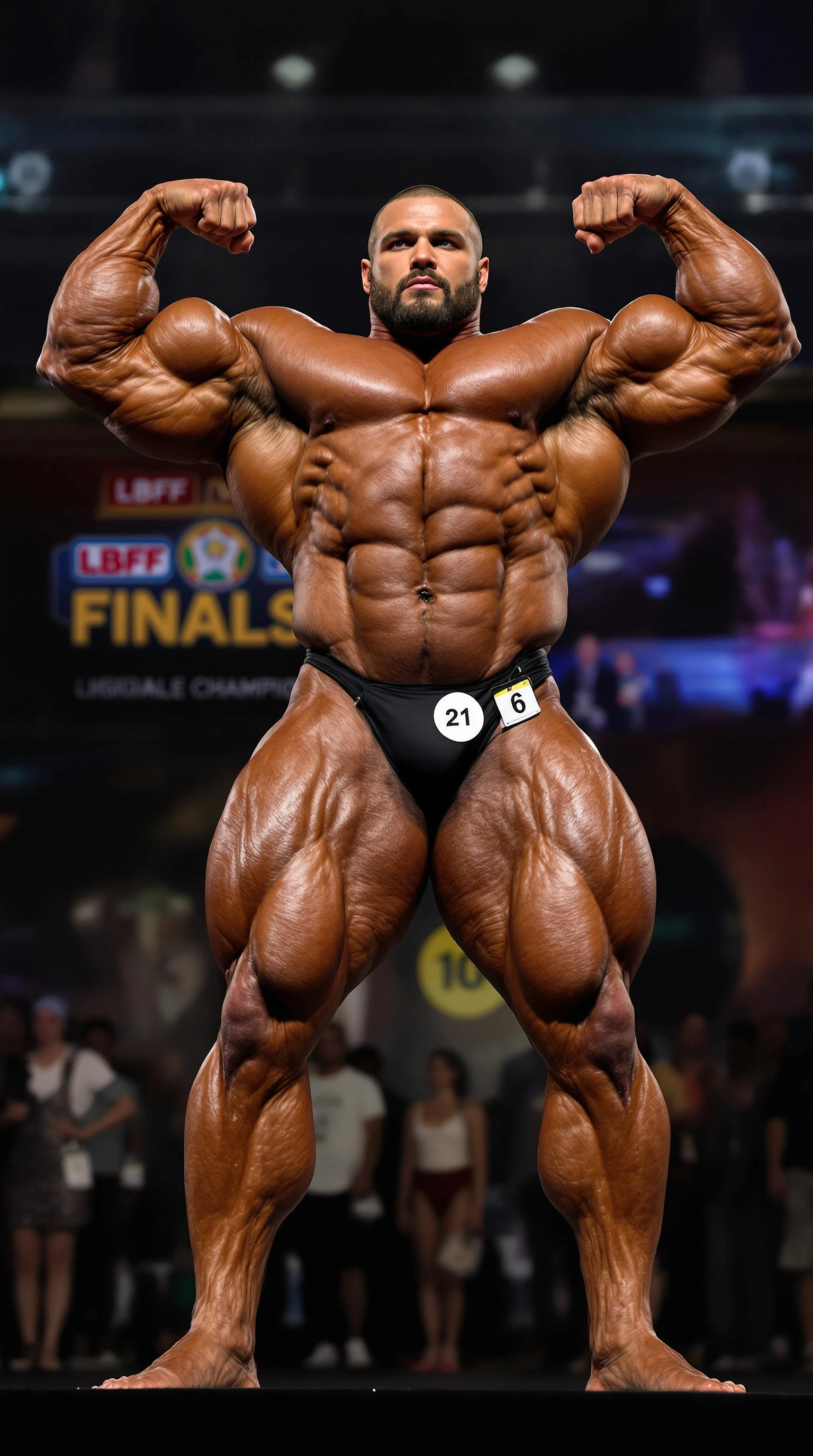 A gigantic, ultra-dry, **super-heavyweight-level**, extremely muscular and hairy American (Caucasian) Classic Physique bodybuilder performing the Front Double Biceps pose on stage during the LBFF (Liga Brasileira de Fisiculturismo e Fitness) Bodybuilding Championship Finals. The athlete is standing on an official LBFF competition stage with professional stage lighting, clear stage number, audience visible in the background, and a judging panel present. Other competitors are visible in the background, standing relaxed or preparing to pose on stage. The bodybuilder wears official black competition posing trunks (similar to string jockstrap, glutes clearly visible) , with a **white round number tag clearly attached to the right hip of the trunks, clearly visible, with number in black text**. His physique features a **massive, wide V-taper**, an **enormously thick chest with deep striations**, perfectly etched 8-pack abs, **extraordinarily huge arms and shoulders** with bulging, veiny biceps and triceps, and **massively thick and deeply separated legs** with visible muscle striations throughout. His glutes and hamstrings are sharply defined and fully flexed. His body is covered with dense, masculine body hair (chest, abs, thighs) , and he has bold, non-offensive sports-style tattoos across the lower abs, groin, and upper thighs. His face is handsome, clean-cut, masculine, with classic American facial features: chiseled square jawline, piercing blue eyes, short stylish hair, perfectly groomed beard stubble. He is performing the official Front Double Biceps pose: arms raised to shoulder height, elbows bent outward, **extremely massive biceps fully flexed and bulging**, chest maximally expanded, abs tight, legs firmly planted and deeply flexed, feet slightly apart. Facial expression confident and dominant. **Camera framing:** directly facing the camera, full frontal view, full body fully visible from head to toe. **No watermark, no text, no logos on image. ** Background softly blurred to focus on the competitor, with other athletes and the official LBFF competition stage clearly visible. Cinematic 9:16, ultra photorealistic, 8K quality.