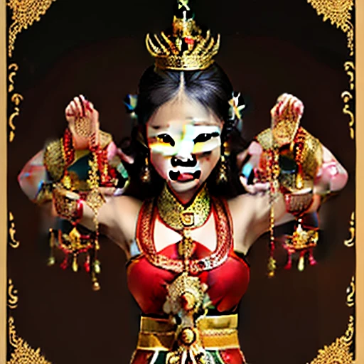The image shows a woman wearing a traditional Thai costume, adorned with ornaments and a crown on her head, standing against a dark background with text at the top and bottom of the image.