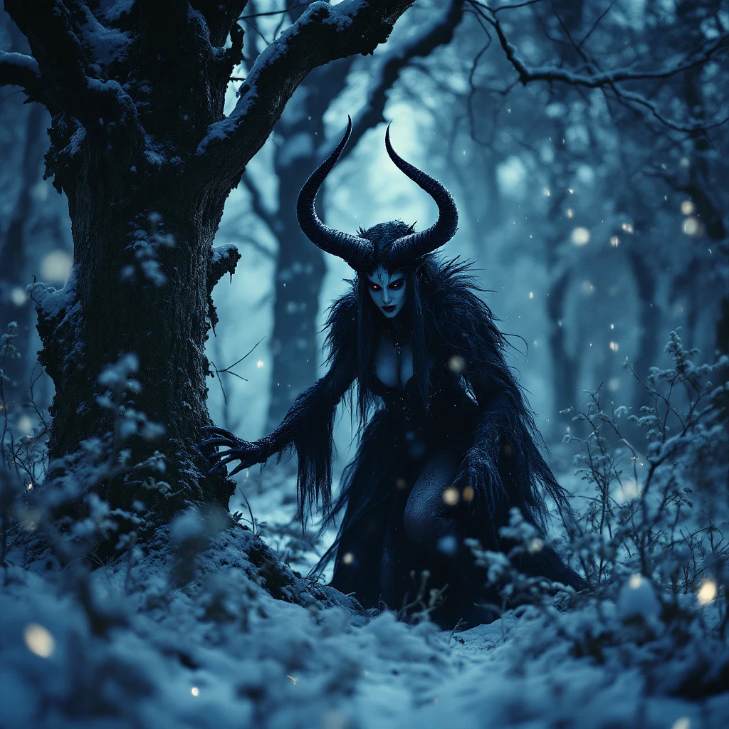 8K, UHD, wide perspective, photorealistic movie still, lens flare, cinematic lighting, dynamic full body shot of an attractive female Krampus lurking in snowy German forest under large tree at night, snowing, feminine,