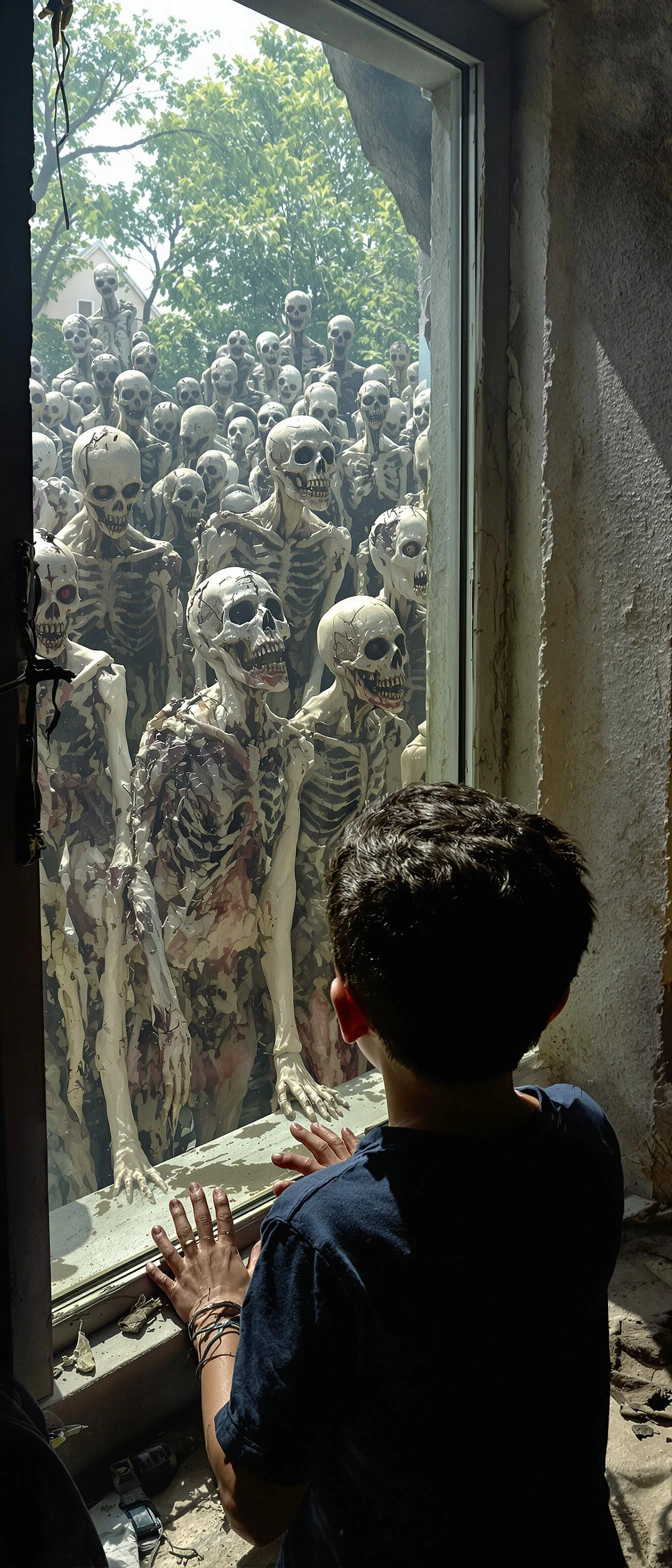 A boy looking from a window at daylight and sees many walking dead people . Their body are fleshy . Some bodies have skin intact . Their body are exposed . Hyperrealistic. Hyper details . Hyper face and body details . 8k . High quality .