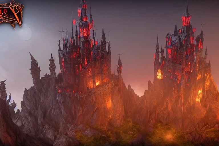 big evil castle - city rock dark shadow elves, might and magic heroes vii, dark fantasy, shadows, artstation trending, unreal engine 5, red