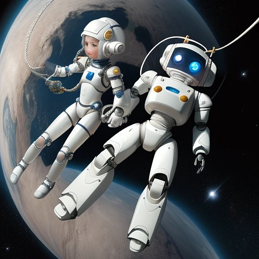 a girl with white armor floating in space and her small robot friend with a rope connecting each other