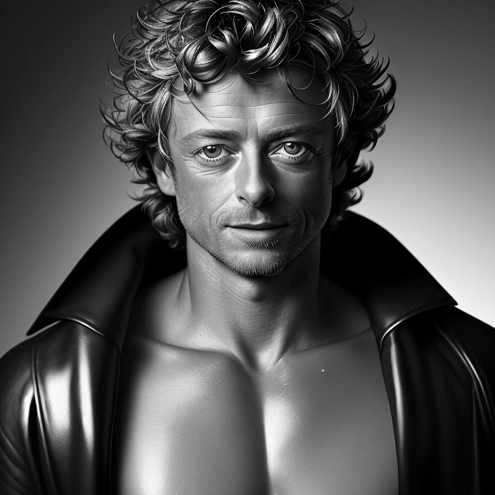 simon baker -black and white lighting - portrait - photo -shiny skin-Rembrandt Light-Shiny skin with details