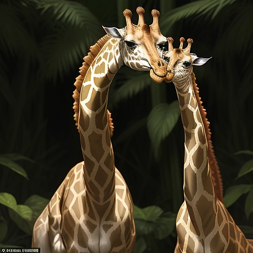 A tall giraffe with a long neck covered in smooth, scaled skin with green and yellow snake patterns. It has the slender, elongated body of a serpent, coiling as it moves gracefully through a lush jungle. The creature’s eyes are sharp and focused, with a forked tongue flicking out.