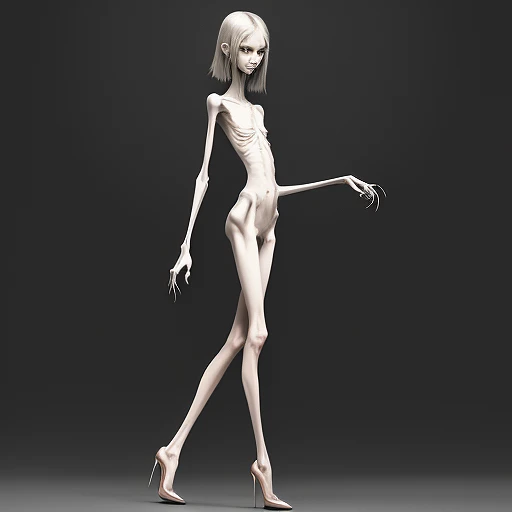 a needle-thin anorexic girl with skinny long legs and long skinny calves in high heels with long hooked claws, naked