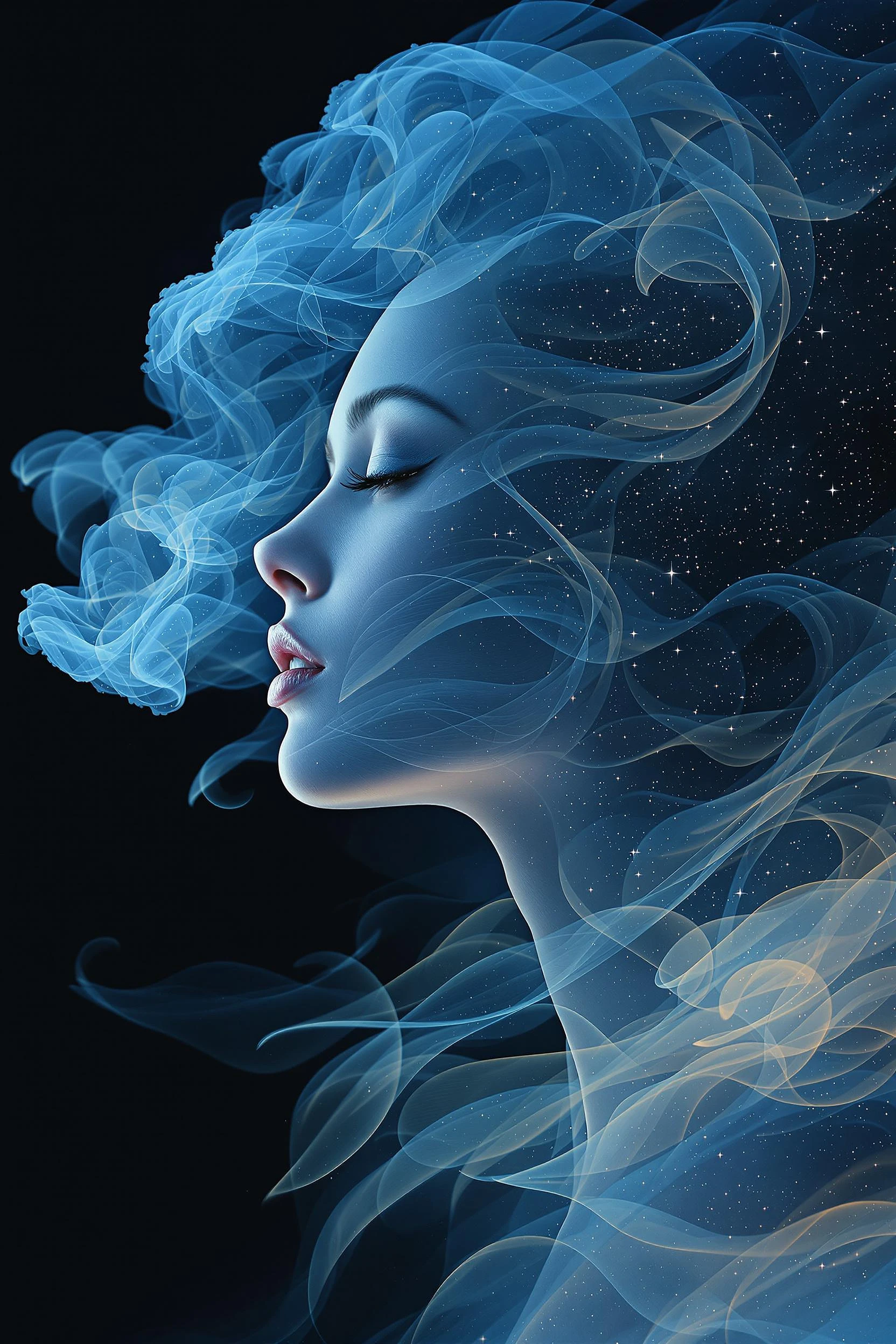 surreal semi realistic landscape photograph, cool blue light to dark gradients, muted soft tones, dark blue light blue midnight blue gradient tones just after the sun sets, blue hour twilight, featuring a surreal and ethereal double exposure style. It depicts the profile of a female figure with a serene expression, her skin appearing smooth and luminous. a large, wispy trailing wave of faint translucent wispy shapes that resembles mares tail cirrus clouds, star filled filled night sky integrated into the design. The color palette is a blend of blues, light and dark contrasting shades and shadows, and faint wispy diffused muted hues, creating a dark emotionally charged atmosphere. The background is a dark gradient, enhancing the powerful tumultuous quality of the scene. The overall composition is balanced but powerful, with intricate details and a sense of elemental power, cool luminous glow. , adding a serene tone to the image. The overall composition is rich in color and detail, creating a soothing and meditative atmosphere.