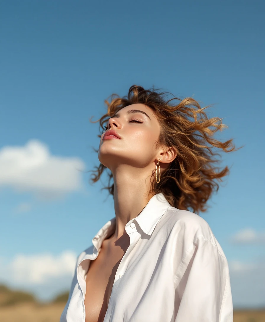 uma mulher com cabelos castanhos claros com fones de ouvido, olhos fechados, aproveitando os raios quentes do sol da manhã ao amanhecer. sol nascente ao fundo, vestindo uma camisa branca dramática, filme, renderização fotorrealista --sref 295570448 --stylize 1000 --profile vr9zbhu