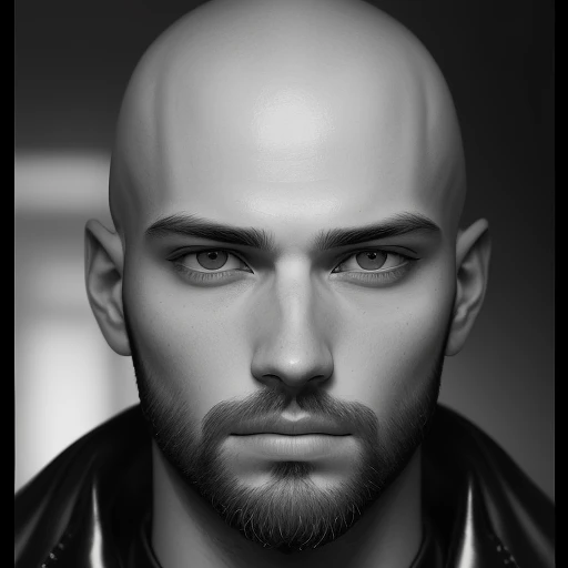 A high detail, black and white wallpaper featuring a young, slim man with a bald head, a slight beard, and an intense gaze at the camera. The extreme close-up shot captures the subject's facial features in stunning clarity, with side lighting accentuating the contours of his head and body. Shot using a Leica 50mm f1. 4 lens, the image has a cinematic quality enhanced in Lightroom, reminiscent of a 16mm film shot on Portra 400 color film. The fine skin pores are visible, adding to the realistic and detailed composition. Shot with a Fujifilm X-Pro3 at f/16. 0 with a focal length of 24. 0, this photograph is a masterpiece in terms of quality and realism.