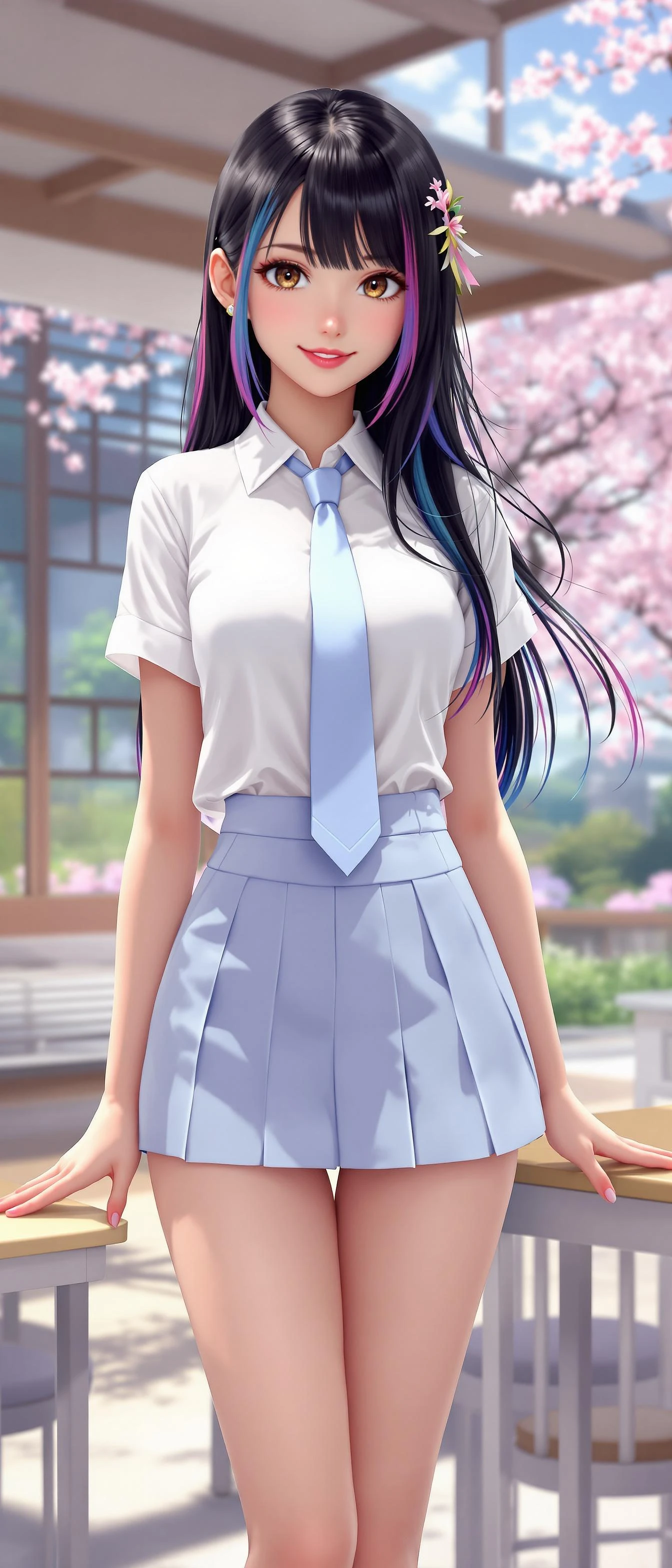 beautiful masterpiece, 3D animation of a girl in classroom wearing a casual business clothes, short sleeves white shirt, light blue tie, light blue mini skirts, pleated mini skirt, thick thighs, thighs gap, medium boobs, standing confidently, table, full body, black hair, long hair, bangs, hair ornament, multi color hair, twirling hair, background Japanese house, cherry blossoms, garden, by sakimi chan