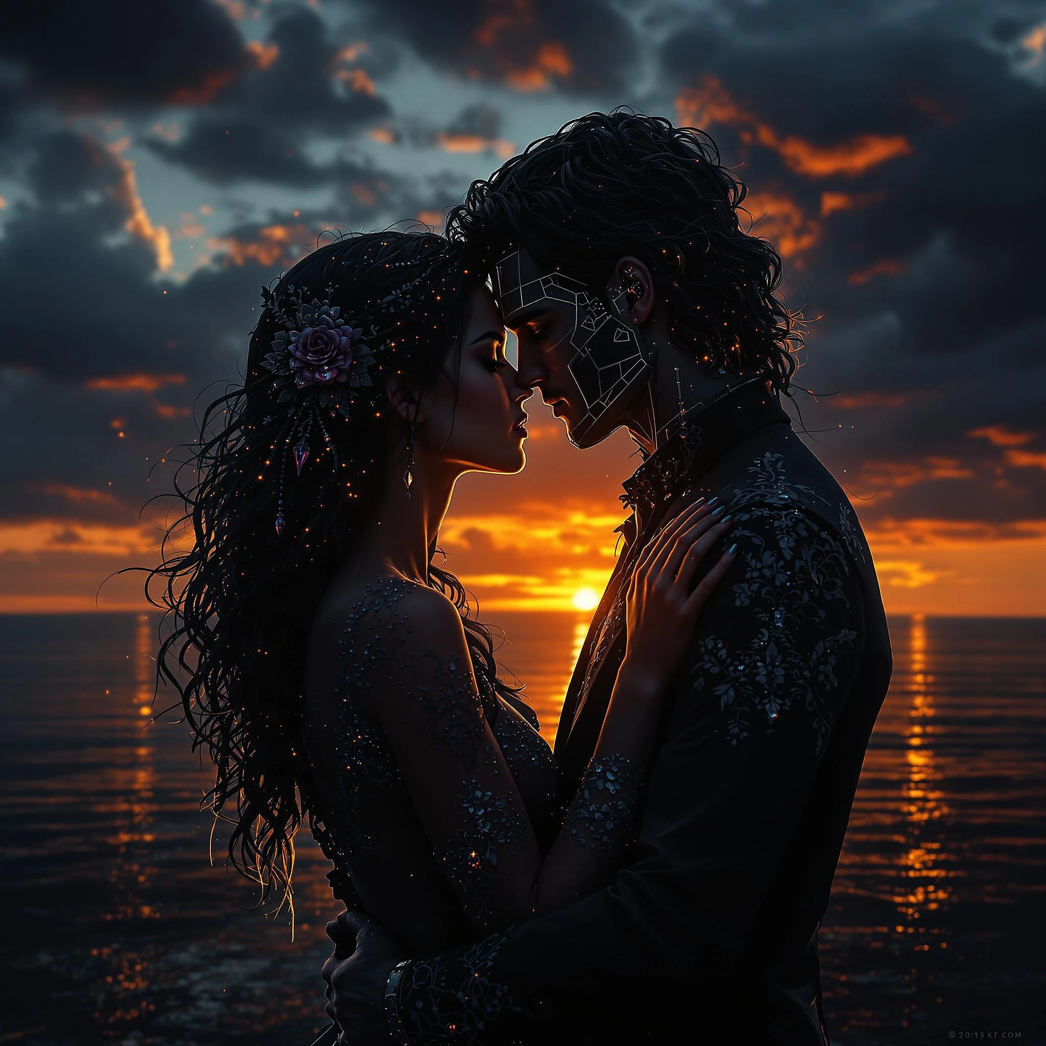 Hyper realistic, photo realism, High Contrast, insanely detailed and intricate, elegant, ornate, super detailed zoomed out side view full body HD Photo of Heart and soul I fell in love with you. The way a fool would do, Madly, Because you held me tight, And stole a kiss there in the night. I beg to be adored. Yes, and I lost control And tumbled overboard, Gladly. That magic night we kissed Oh, we kissed, There in the moon mist. Oh, but your lips were thrilling, Much too much too thrilling, Never before were mine so Strangely willing. Darling, and now I see What one embrace can do, Come on and look at me You've got me loving you, Madly, That little kiss you stole All my heart and soul. it is night time, there are dark clouds rolling in on the night sky on the Reddish Orange sunset in the background. No poorly formed fingers, no extra arms, no extra legs, no extra fingers, no poorly formed hands, no poorly drawn body, no poorly drawn teeth, no bad anatomy.