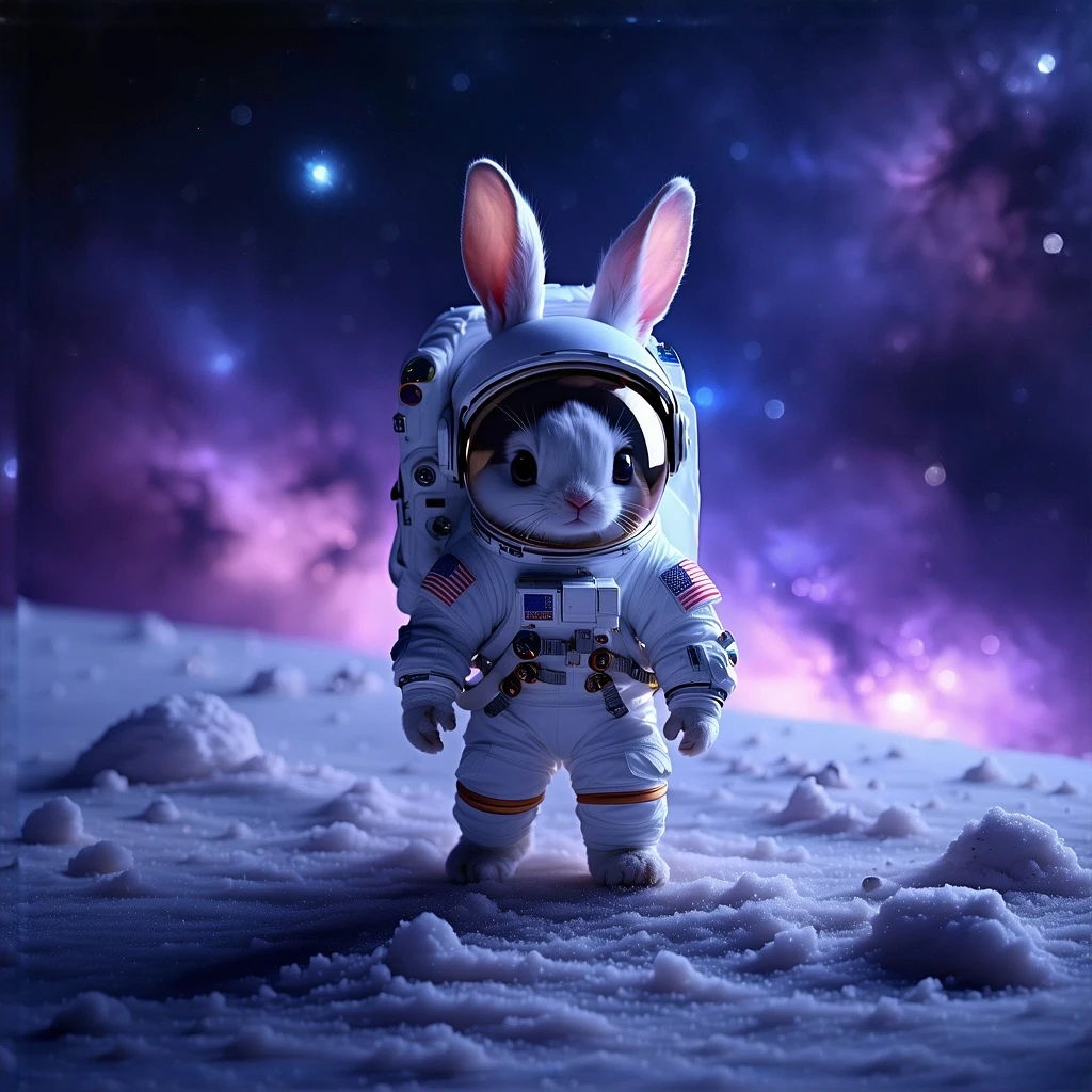 Astronaut Bunny Floating in Space Imagine a fluffy, white bunny, wearing a sleek, futuristic spacesuit, drifting weightlessly in the vast expanse of space. The bunny’s oversized helmet reflects the soft glow of distant stars, which twinkle across the dark, cosmic background. Its large ears flop slightly to one side, adding a sense of playful innocence to its serious space exploration attire. The scene is illuminated by a mix of ambient starlight and a gentle, ethereal light coming from a nearby nebula. The nebula is a stunning blend of purple and pink hues, casting a soft glow over the bunny and the surrounding space. The cosmic dust around the bunny shimmers faintly in the glow, creating a sense of depth and vastness. In the distance, the planet Earth is just a small, distant orb, offering a sense of scale to the bunny’s tiny figure in the infinite universe. The vastness of space contrasts with the delicate, almost whimsical presence of the astronaut bunny. Lighting: Soft, diffuse lighting from the nebula creates a surreal, dreamlike atmosphere around the bunny. Stars twinkle with cooler, white-blue hues in the far background, gently illuminating the spacesuit. A faint, warm light source from the bunny's visor reflects off the suit, adding a touch of realism to the scene, with the reflective surface catching glimmers of distant starlight. Quality: High-resolution detail with crisp textures on the bunny’s spacesuit, capturing every fold and stitch. Stellar background filled with intricate constellations, giving the vastness of space a real sense of depth. Subtle light effects highlighting the reflective surfaces of the bunny’s visor and helmet, providing a realistic glow. Smooth gradients of purple and pink nebulae blending seamlessly into the dark space, with stars rendered in soft, sparkling detail, cinematic, hyper realism, high detail, octane render, 8k