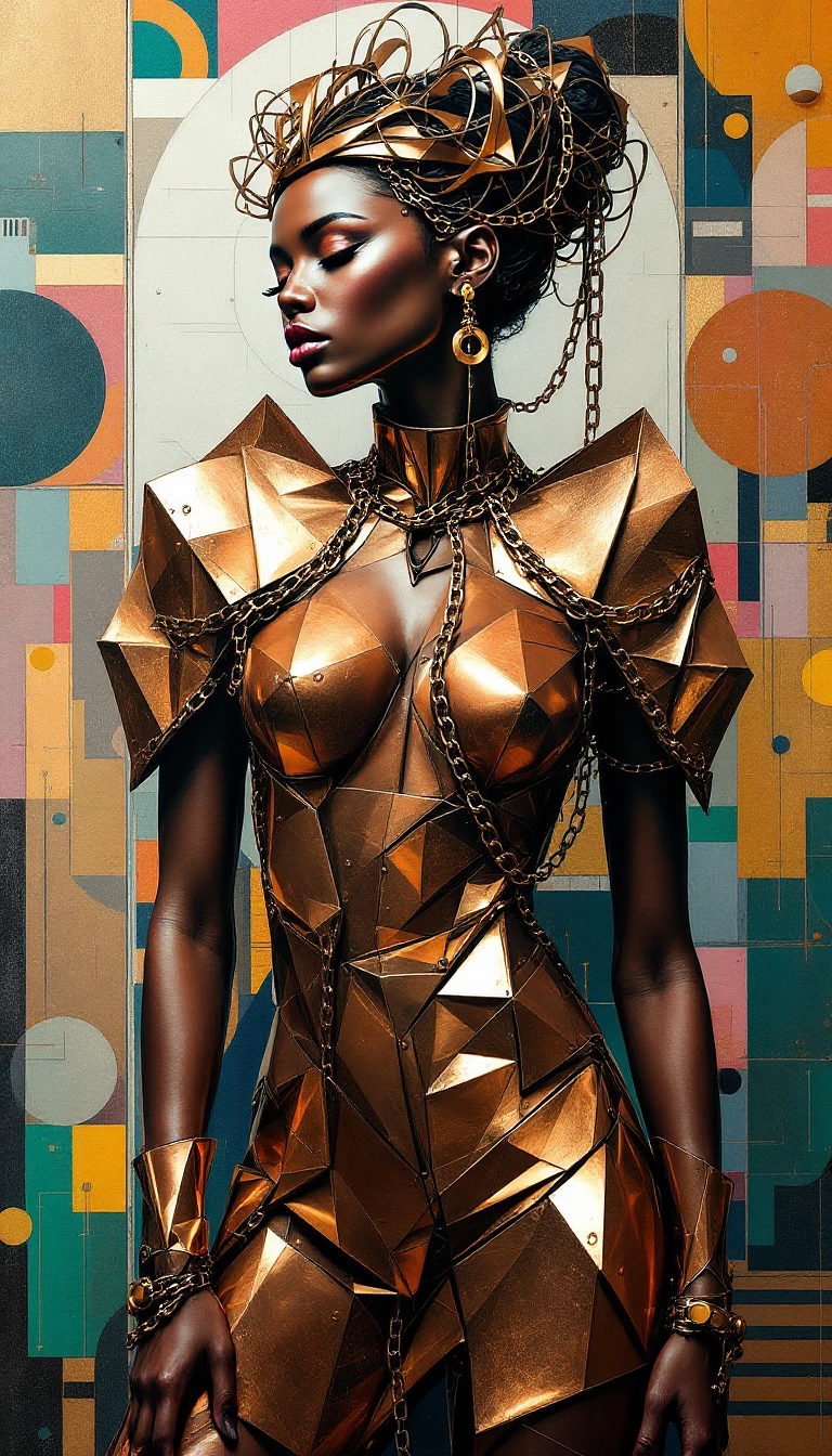 A captivating acrylic painting of an abstract female figure adorned in a breathtaking dress, crafted from polished bronze panels and intricate metallic chains. The dress has a sharp, geometric silhouette, with its layered panels and chain detailing enhancing the figure’s powerful and structured appearance. Atop her head, a metallic crown entwines with the panels, emanating a sense of industrial beauty. The background is filled with vibrant geometric shapes and patterns, creating a modern and dynamic tapestry. This stunning piece of art incorporates elements of graffiti, conceptual art, fashion, 3D render, and ukiyo-e, making it a truly unique and captivating masterpiece with a vivid and hd quality.