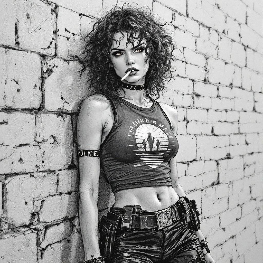 A very well done pencil sketch, just use some red color to give the main points of a full body cyberpunk female character, around the age of 20 leaning against a brick wall smoking a cigarette and looking away from the camera. They have an angry face. They should be wearing a police outfit a tank top with a 80s palm and sun design and heavy boots and their hair is reminiscent of makima from Chainsaw man, but curly hair. like malin akerman as laurie jupiter