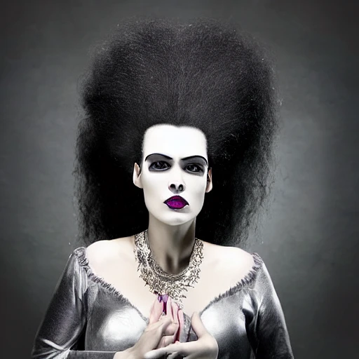 a vibrant professional studio portrait photograph of bride of frankenstein, black hair with a large white streak, goth, attractive, friendly, casual, delightful, intricate, gorgeous, female, piercing purple eyes, wears a silver necklace, femme fatale, nouveau, curated collection, annie leibovitz, nikon, award winning, breathtaking, groundbreaking, superb, outstanding, lensculture portrait awards, photoshopped, dramatic lighting, 8 k, hi res