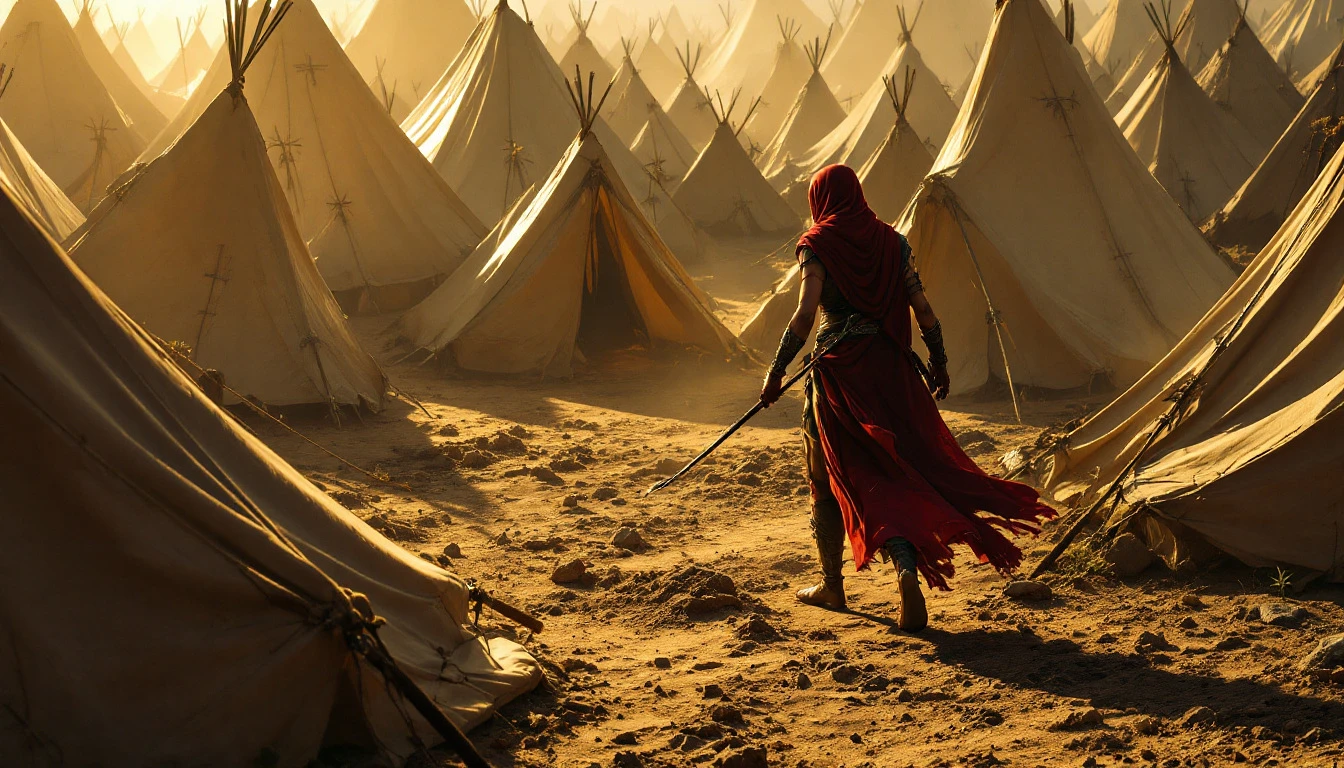 Ultra-realistic . Medium shot of Yutab infiltrating the enemy camp, her shadow falling across the tents. [Yutab: stealthy Achaemenid Persian figure, in lightweight archer gear, no helmet for stealth.]