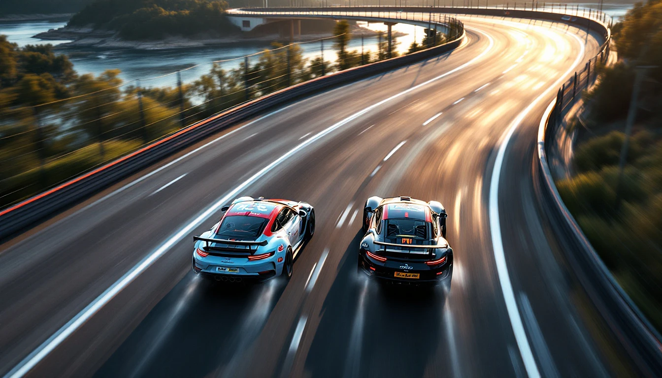 The race track is well lit by sunlight. The track turns and passes over a bridge over a river, the first two (2) cars with logos of different clubs on the sides are racing down the track, overtaking each other. Light smoke from under the wheels. All the cars on the track are racing in the same direction. There are no other cars. The camera looks sideways and slightly overhead and turns behind the passing cars. Cyberpunk style.